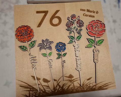 In 2026 habe ich mir noch einen Laser für Holz/Acryl angeschafft. Mit diesem fertige ich dekorative Geschenke aus Holz und Actryl. Vieles ist auch peronalisierbar, z.B. mit einem persönlichen Text oder auch einem Foto. Auch hier finden einige Artikel einen Platz in meinem Onlineshop. Gern kann ich auch Ihre Wünsche zur Gestaltung prüfen. Bitte nutzen Sie zur Anfrage unser Kontaktformular.